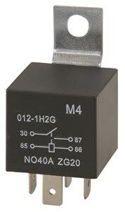 Whilst designed for auto horns, this relay is ideal for any high current application i.e. burglar alarms, ignition cutout, transmitters, car spotlights etc., - as well as for horns! SPST normally open contacts. - Contact current (max) 40A- Contact voltage (nom) 12V - Nominal coil voltage 12V.