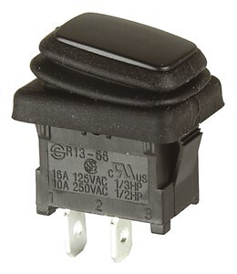 SPST mini rocker switches with spade QC lugs. Sealed with a rubber boot and IP65 rated.