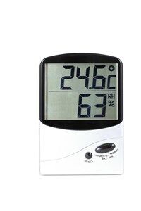 Displays the temperature and humidity together on the one huge LCD display. It also has a min / max function (memory). Switch between C° and F°. Requires AAA battery