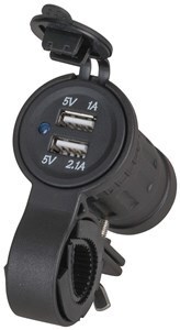 A motorcycle dual USB socket mount is a great addition to your motorcycle when out touring. This is a full kit with an inline fuse to install directly to your motorcycle to give you two USB ports. It can be used to charge your smartphones, GPS, sports cameras or anything that can be powered by a USB Socket. Fits the common motorcycle handle bar diameters of 17-33mm.