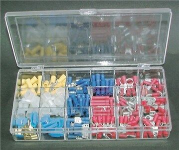 We had this pack especially made for us. It basically consists of a box of all the standard 1/4" (6.35mm) Q.C. tabs and recepticles, but also the odd Q.C. sizes ie: 3.3mm and 4.8mm sizes. To finish off the box we've thrown in a heap of other handy connectors as well. It is a great kit of wire connectors / terminator hardware.