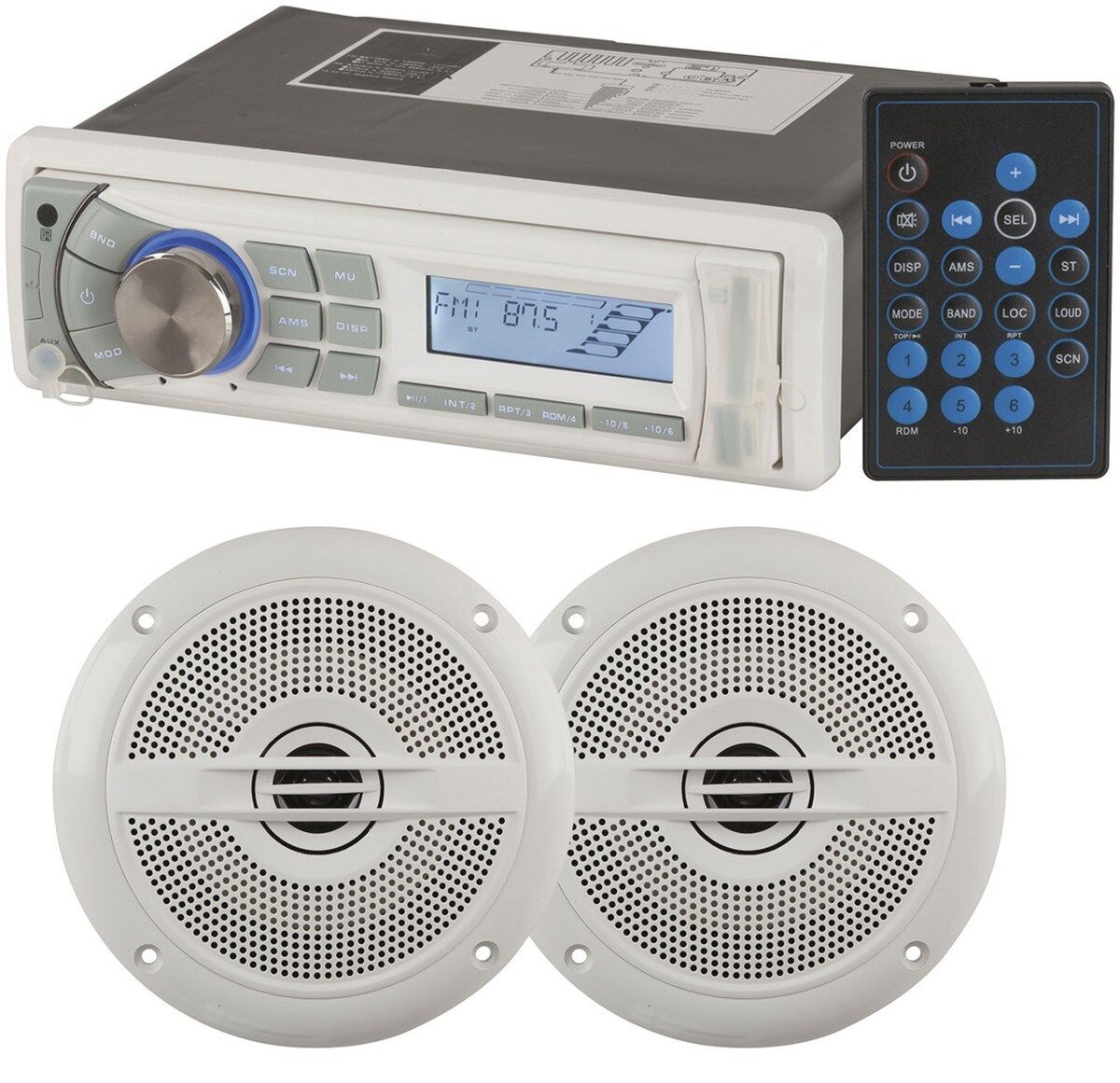 QM3816 Combines our Marine radio (QM3815) with our 5" Marine speaker (CS2410).Marine AM/FM Radio with MP3 Player (QM3815)An attractive marine radio perfect for your boat but can be used for automotive purposes. In addition to standard AM/FM radio the front panel includes USB & SD card slots which allow playback of MP3s. There's also a 3.5mm auxiliary port so you can connect an iPod, headphones, or Smartphone for playing back music. The unit can be controlled with the infrared remote or front panel interface. For audio tinkerers, a myriad of settings are available including bass, treble, balance, and fade settings. There are also rock, pop, and classical equalisation pre-sets to suit your taste in music. Installation is straightforward, just connect via the supplied 14pin plug, all speaker cables are labelled to streamline the install. The USB, SD card and AUX sockets all come with splash proof silicone covers.Specifications:• MP3/USB/SD Player• Rust-resistant chassis • ISO/DIN mountable • Electric Detachable Panel • UV-resistant faceplate and trim ring • 3.5mm front panel aux input• USB/SD front panel input• Wireless infrared remote• Power: - 8.25WRMS / 8 Ohm x 4 - 13WRMS / 4 Ohm x 4• Dimensions: 189(L) x 117(W) x 57(H)mm5" Marine Coaxial Speaker (CS2410) A pair of marine worthy speakers designed to withstand the demands of ocean use and provide excellent audio quality in your boat. Features high salt and UV resistance and are fully splash proof thanks to the special indented design.Specifications:• Power handling: 30WRMS • Nominal impedance: 4 ohms • Frequency: 80-20KHz • Sensitivity: 88dB/W/M • Magnet: 5.3 oz • Voice Coil: 25mm • Woofer: Injection Cone • Midrange and Tweeter: 30mm Mylar Dome Tweeter • Dimensions: A = 150mm, B = 135mm , C =111mm , D =45mm